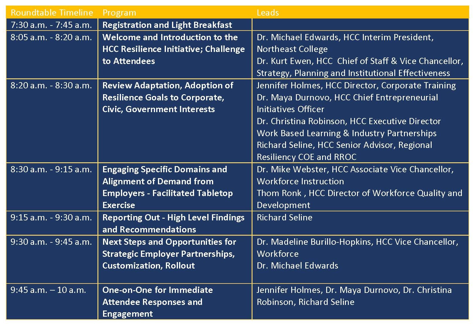 Agenda Corporate-Civic-Government Employer Roundtable "Aligning Public Safety, Disaster Mitigation, and Workforce Needs" March 10, 2022 | 7:45 a.m. - 10:00 a.m. HCC Central Campus, 1300 Holman, William W. Harmon Building, Room 100