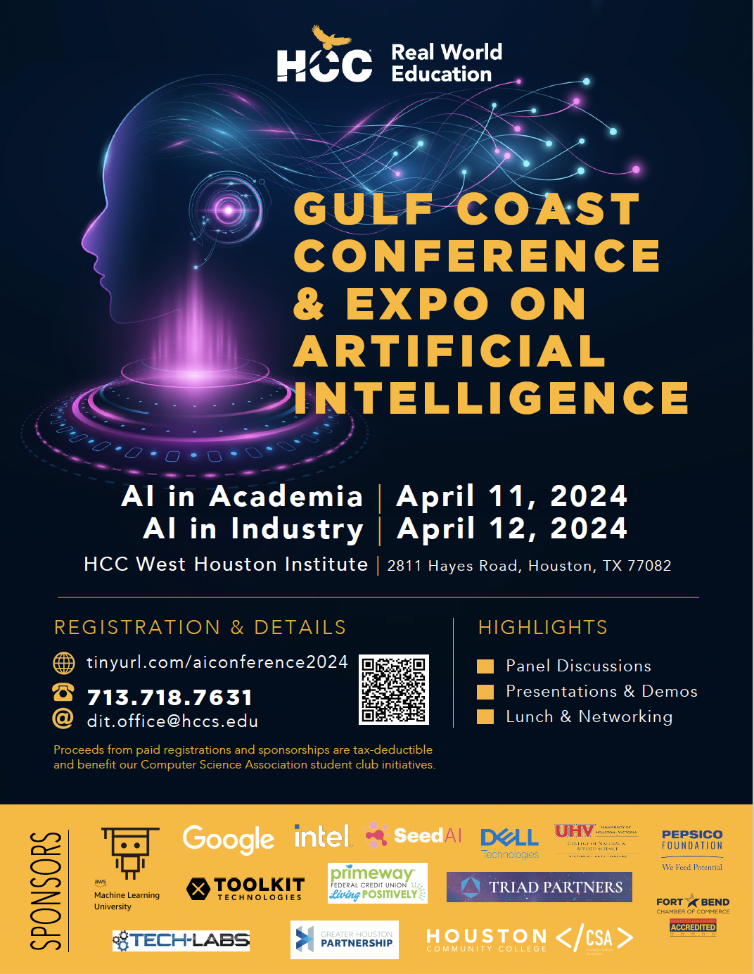 The Gulf Coast Annual Conference on Artificial Intelligence aims to explore the technological advances and innovation brought by AI. The discussion will also center on how academia and industry can partner to build a local talent pipeline for responsible AI development for the prosperity of our region. With HCC being the first community college in Texas to offer an associate degree in Artificial Intelligence and having recently launched its bachelor’s degree in AI & Robotics in fall 2023, the AI/Computing field in Houston is poised to flourish for a broad range of local industries.