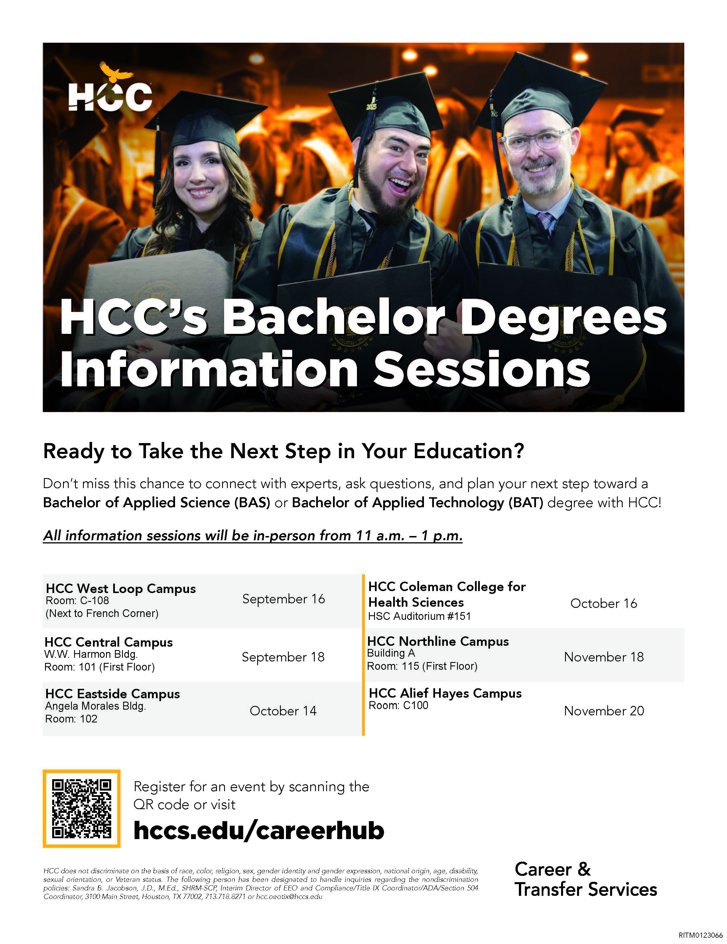 Don't miss your chance to connect with experts, ask questions, and plan your next step toward a Bachelor of Applied Science in Healthcare Management (BAS) or Bachelor of Applied Technology in Artificial Intelligence & Robotics (BAT) degree with Houston City College!